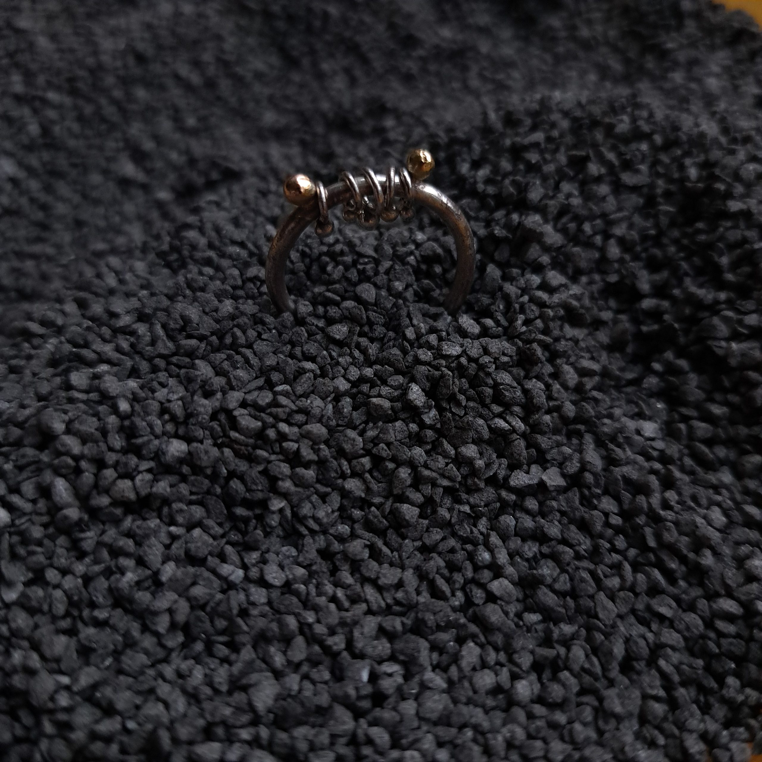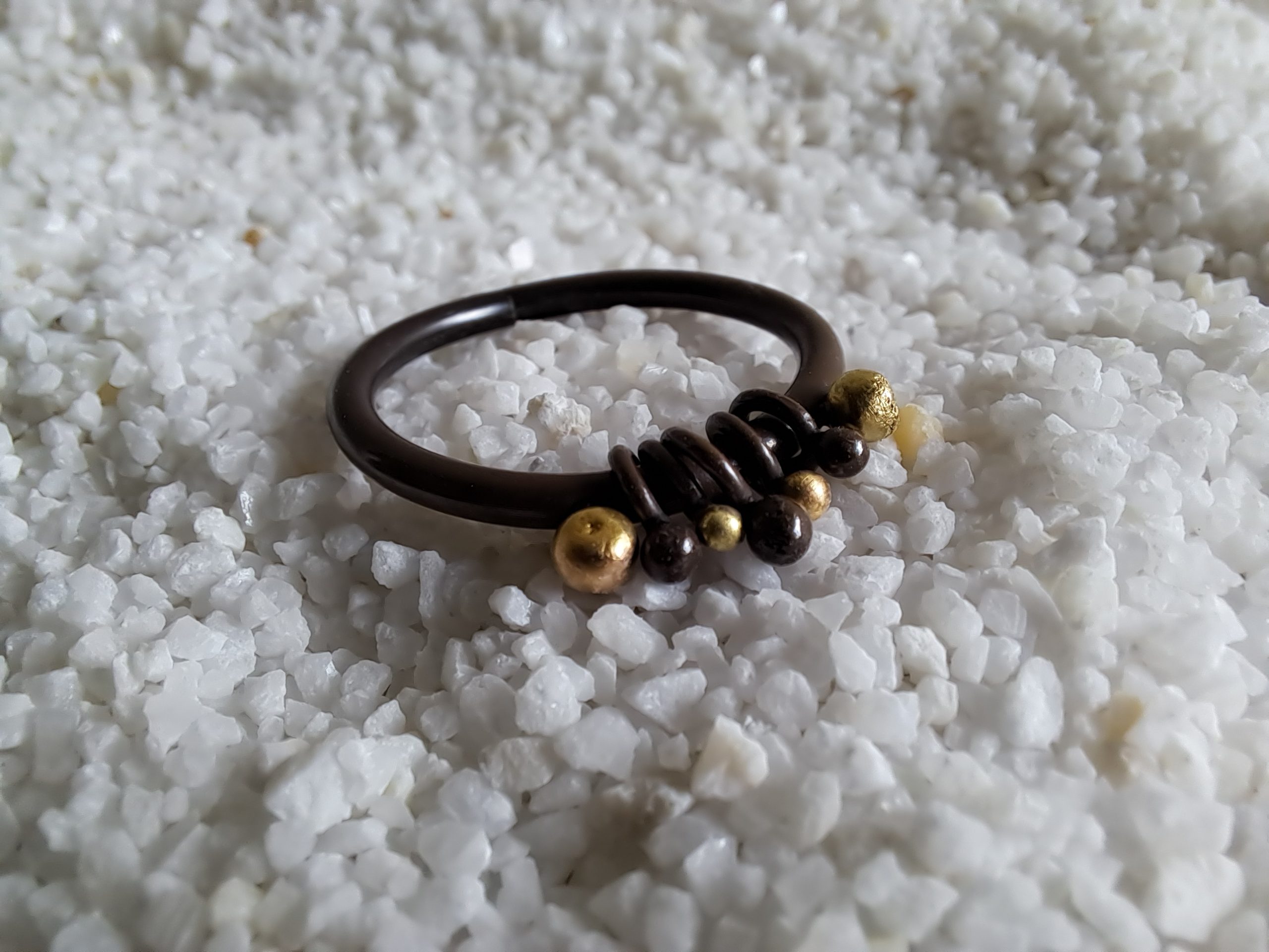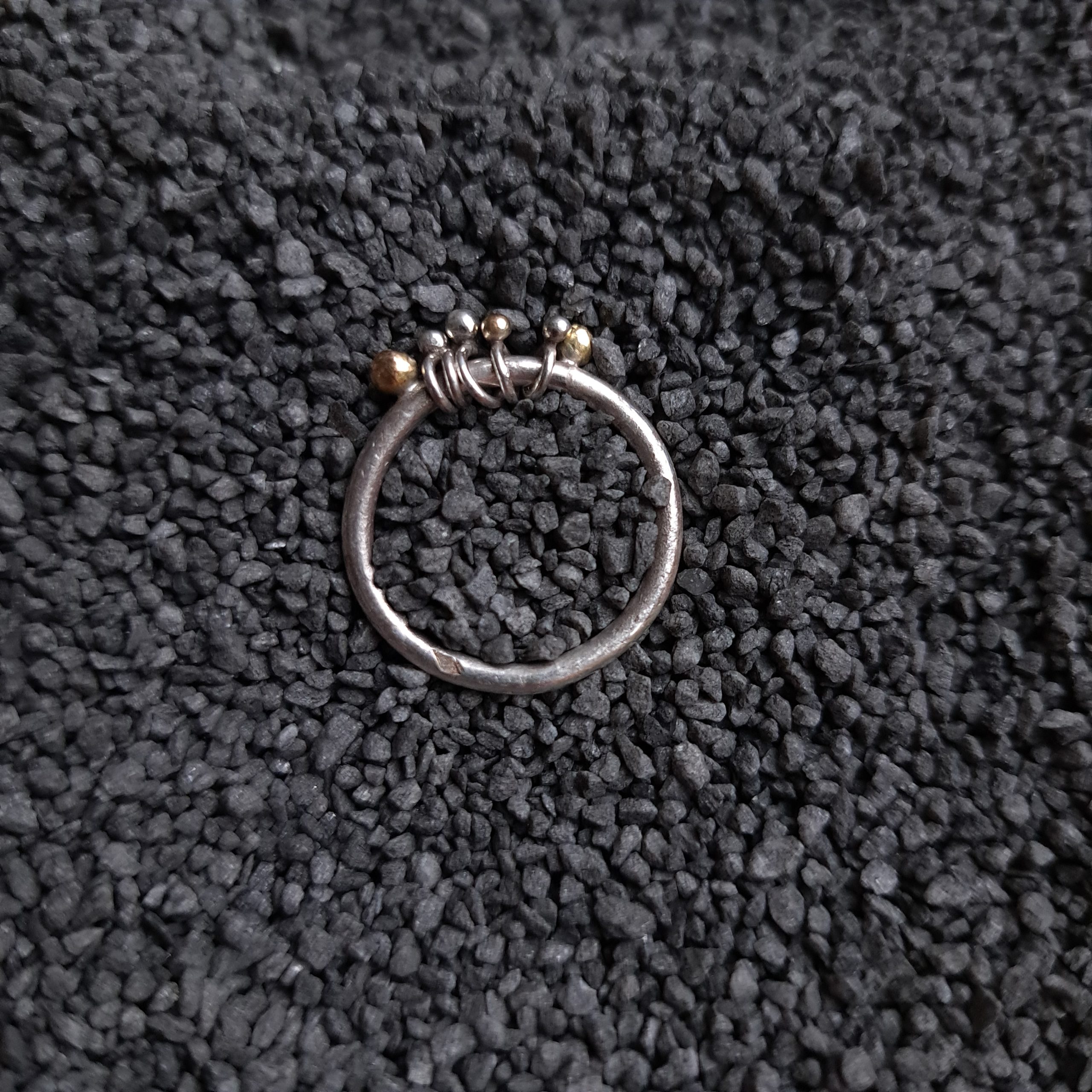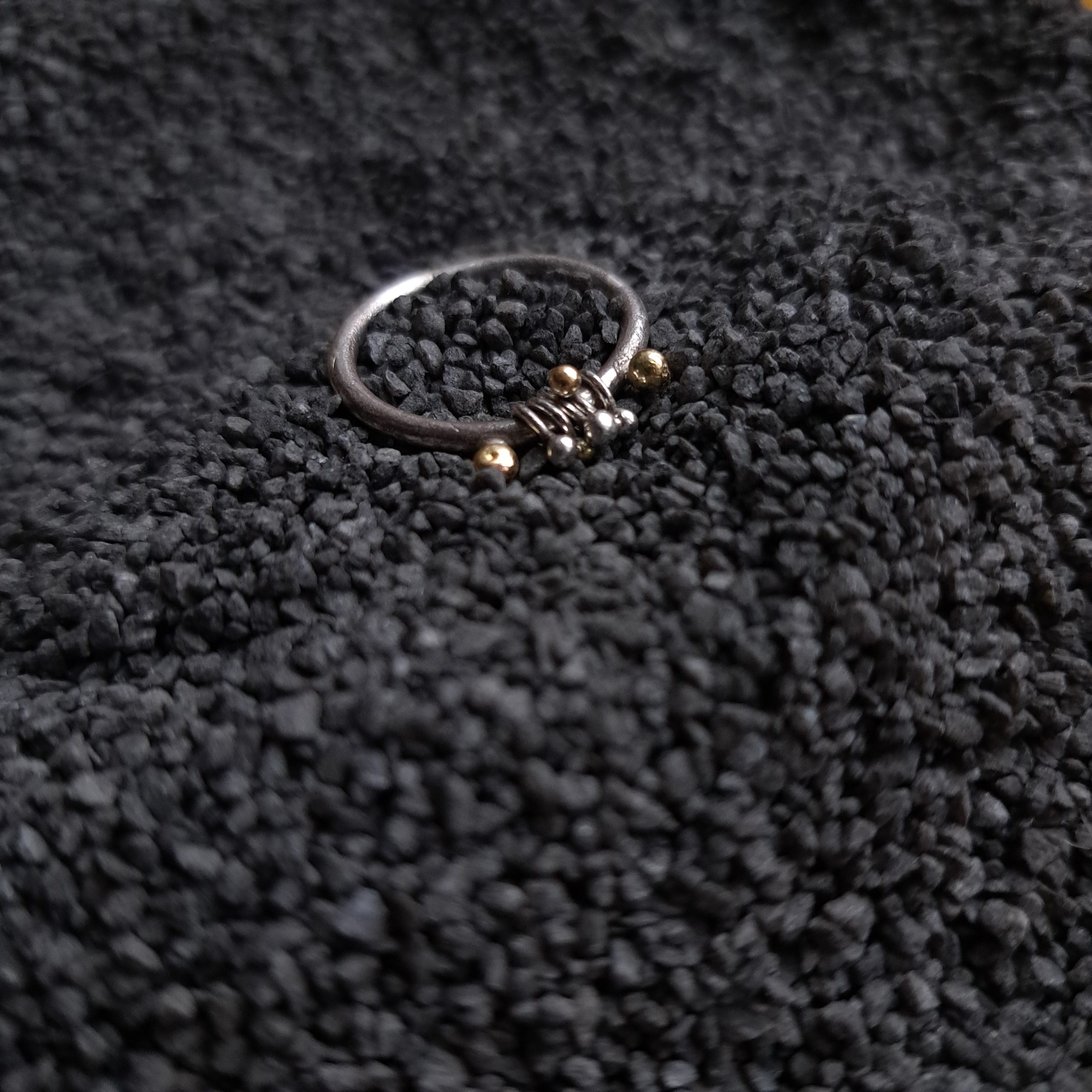 Le modèle signature est composé de 7 billes, 4 en or 750°°° et 3 en argent 925°°°, corps de bague en argent 925°°°, avec finition argent brossé ou argent noirci*.