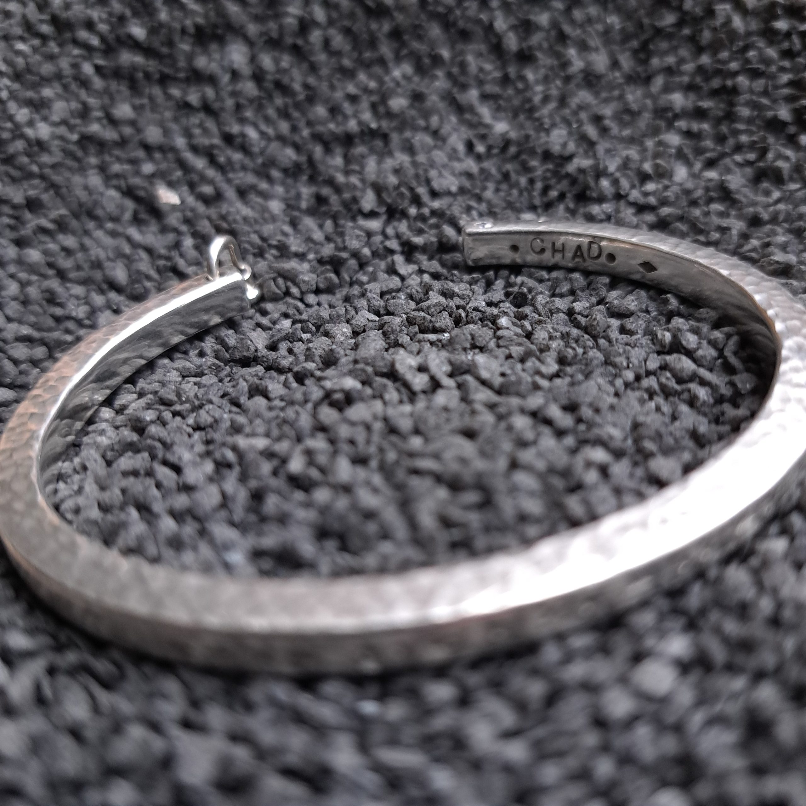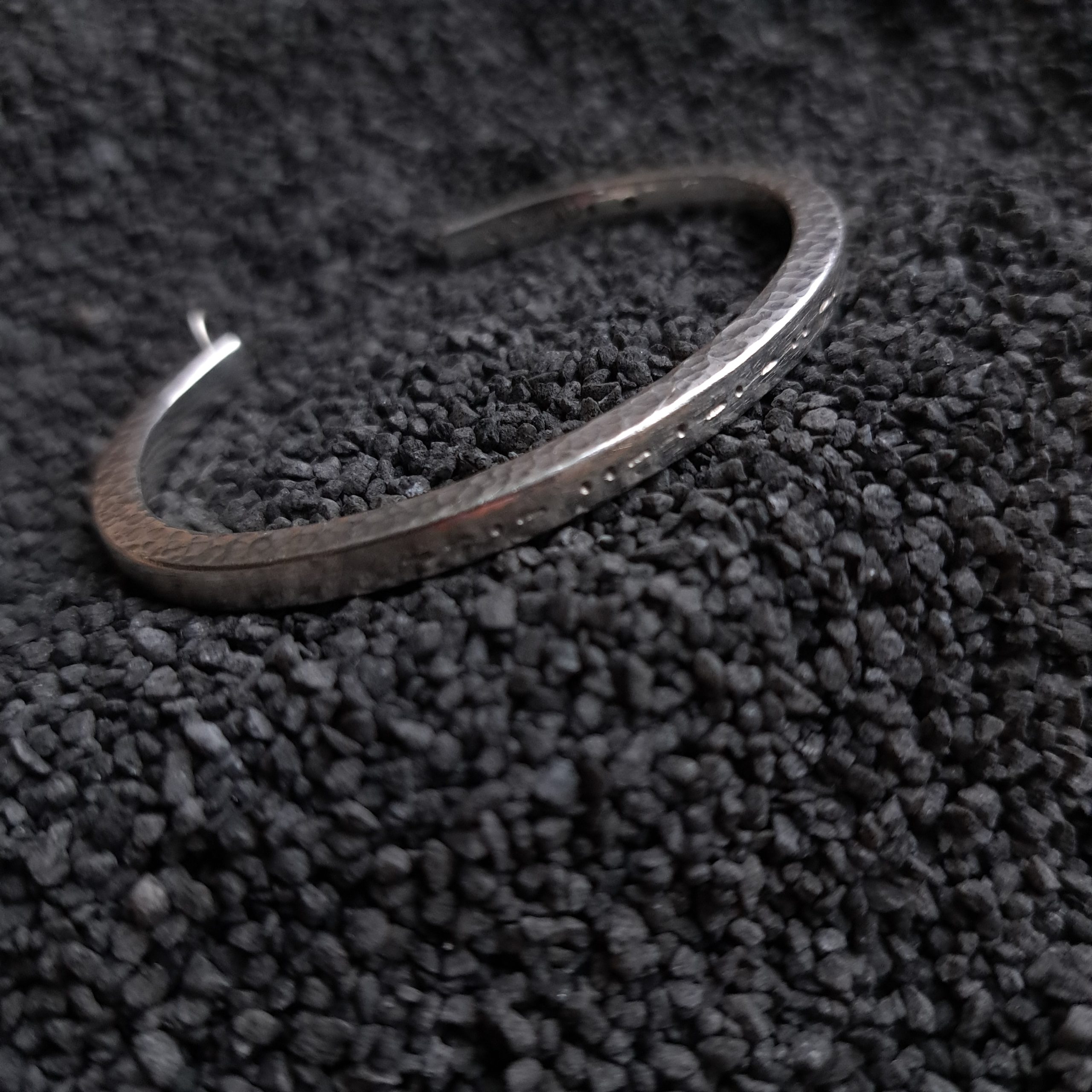 Jonc ouvert en argent 925°°° à personnaliser. Votre message gravé en code Morse sur la face visible. La traduction de votre message gravée sur la face intérieure. Martelé sur les côtés, motif au choix : martelé rond ou strié. Finition au choix : argent simple ou patiné (noirci dans les tous reliefs creusés, voir 4è photo). Attention à la taille choisie, ce jonc ne s'étire pas pour passer votre poignet. Je peux vous conseiller si vous hésitez entre 2 tailles :) Pour définir votre message à graver, merci d'utiliser le formulaire ci-dessous. Bijou réalisé à la main sur commande. Délai avant envoi : 2 à 3 semaines. Fabrication à l'atelier selon les techniques artisanales de la bijouterie.